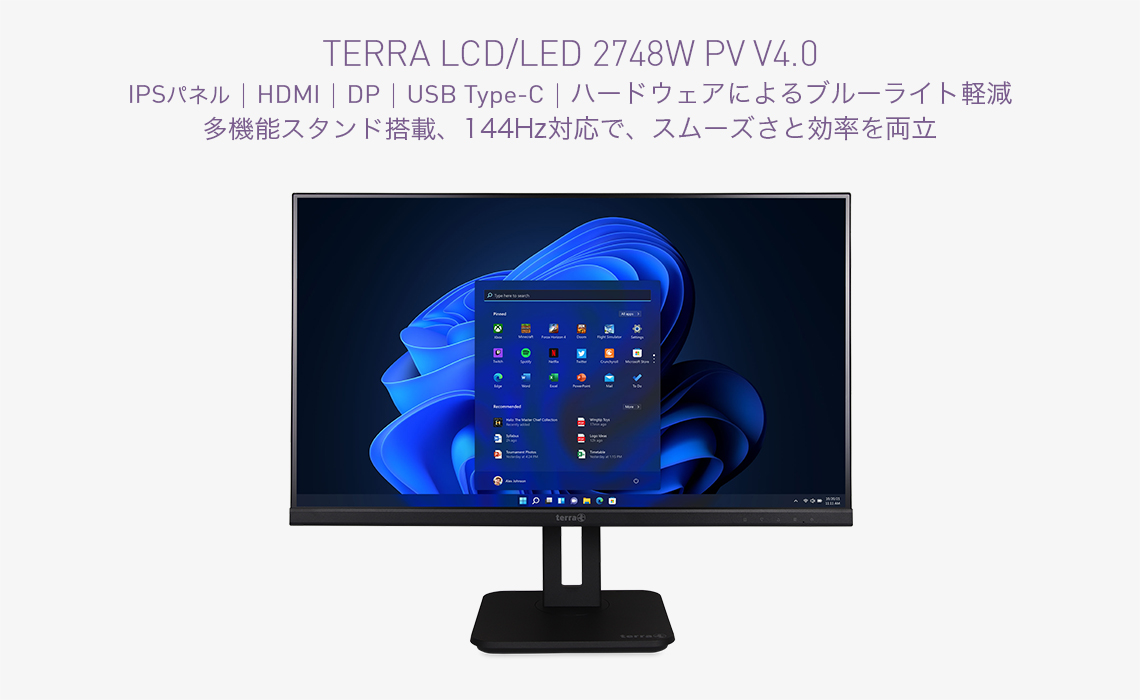 「TERRA 2748W PV V4.0」は、フルHD (1920×1080)の高解像度に加え、広視野角 (水平/垂直178°)と高輝度 (300cd/m²)のIPSパネルを採用、144Hzの高リフレッシュレートに対応しており、動きが滑らかで残像が少なく長時間の業務における目の疲労を軽減しながら、高い表示性能で業務効率を高めるLCDディスプレイです。高さ調整や角度調整に加え、画面を回転できるピボットスタンドを搭載しており、デザイナーやプログラマー、リモートワーク、オフィスワーク、教育現場など、幅広い業務に適応します。
