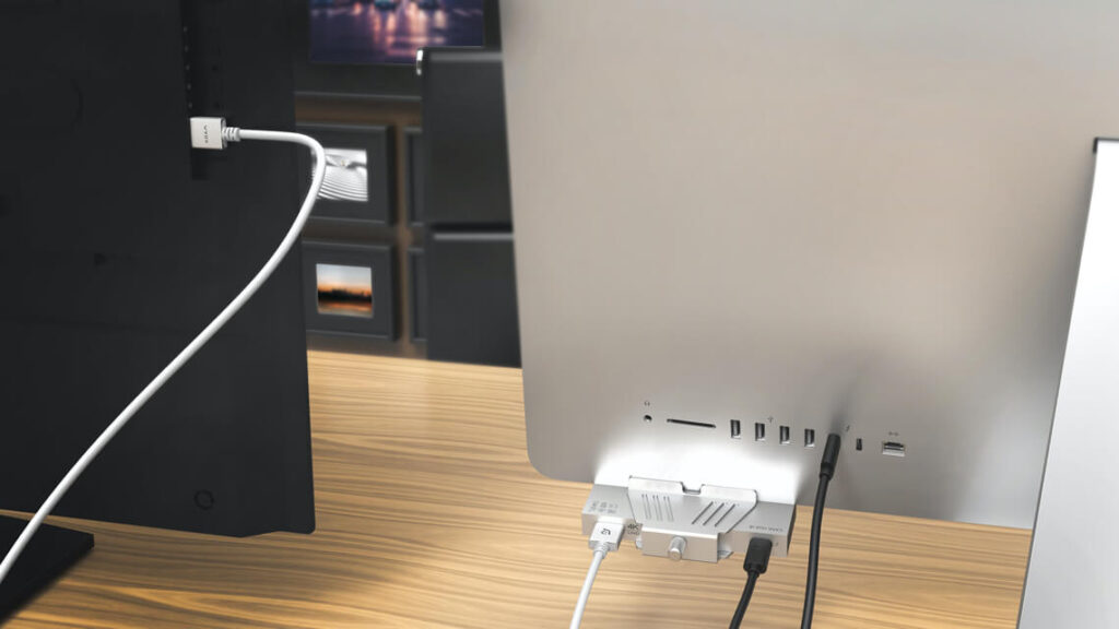 HDMIディスプレイアダプター、オーディオ、3ポートハブ (Type-C x 1, Standard A x2)、リーダーライターがiMacにピッタリ合体します。
