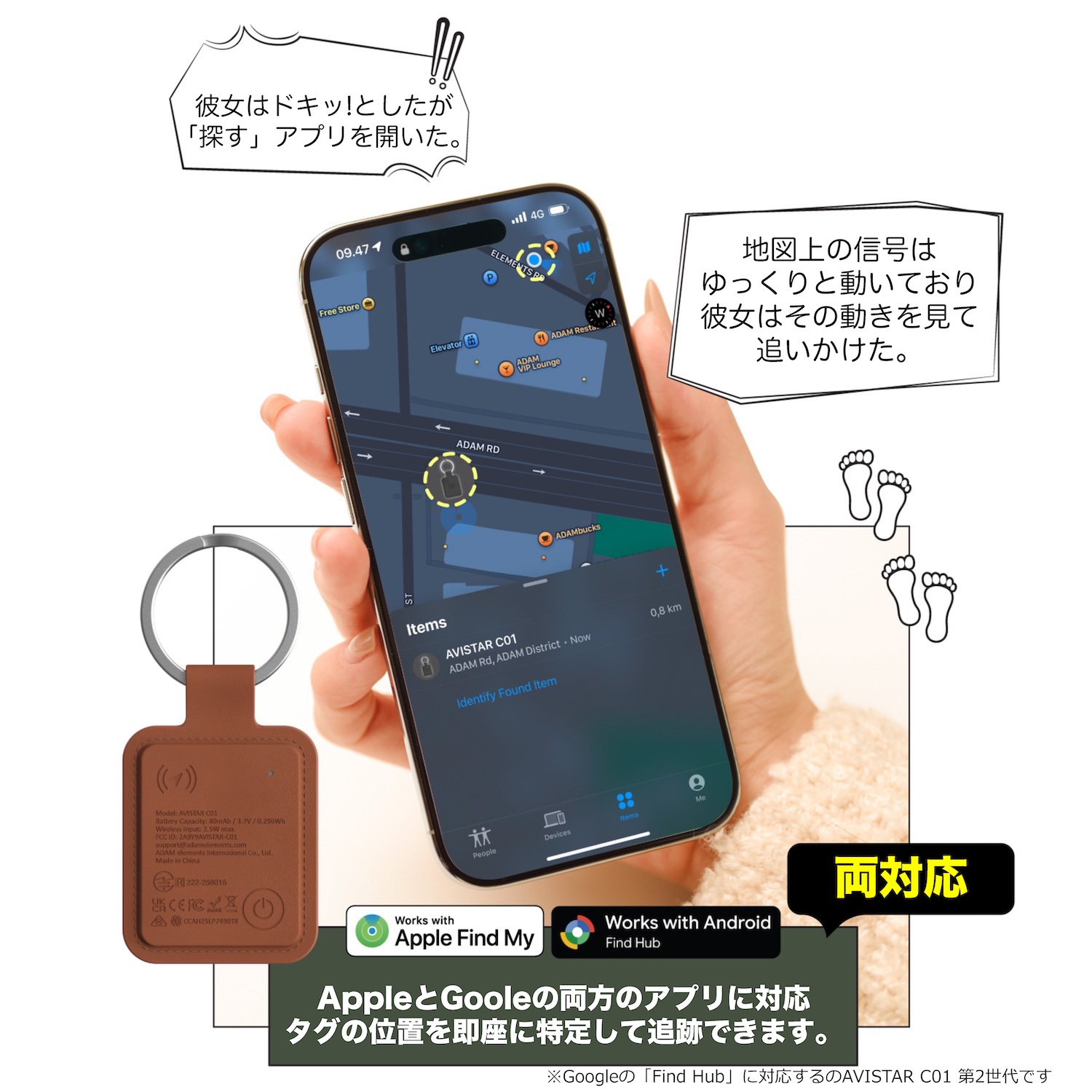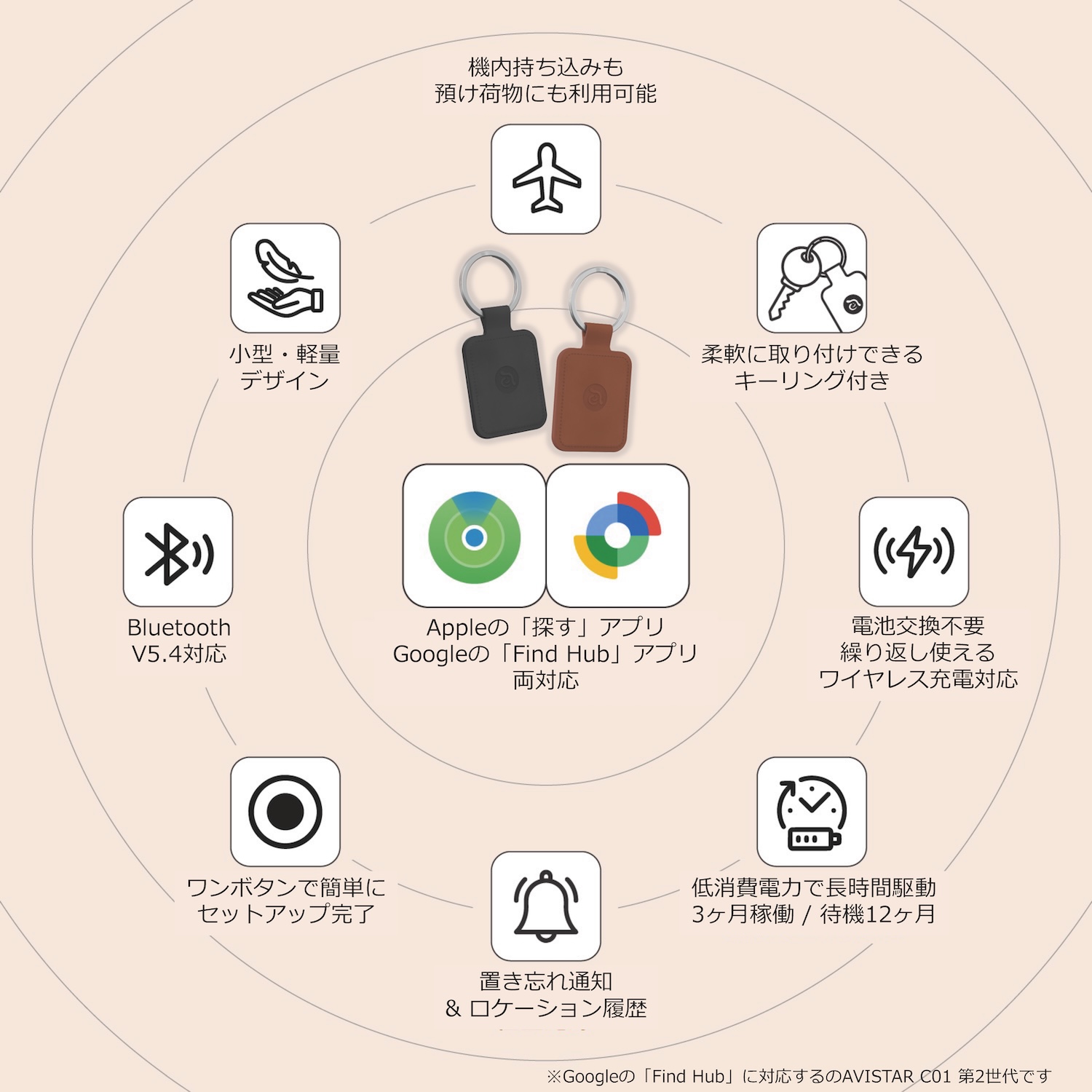 | 対応OS: | iOS 14.5以降、iPadOS 14.5以降、またはmacOS Catalina以降 ※2ファクタ認証を有効にする必要があります ※「探す」アプリを利用するにはiCloudにサインインしたApple IDが必要です ※「探す」アプリは最新バージョンのiOS、iPadOSでのご使用を推奨します ※Googleの「Find Hub」に対応するのはAVISTAR C01 第2世代です | iOS 14.5以降、iPadOS 14.5以降、またはmacOS Catalina以降 ※2ファクタ認証を有効にする必要があります ※「探す」アプリを利用するにはiCloudにサインインしたApple IDが必要です ※「探す」アプリは最新バージョンのiOS、iPadOSでのご使用を推奨します Android 9.0 (Pie)以降 ※GoogleアカウントにログインしFind Hubを有効にする必要があります ※画面ロック (パスワード、PIN、またはパターン)が有効になっている必要があります ※一度に1つのシステムとのみペアリングできます |