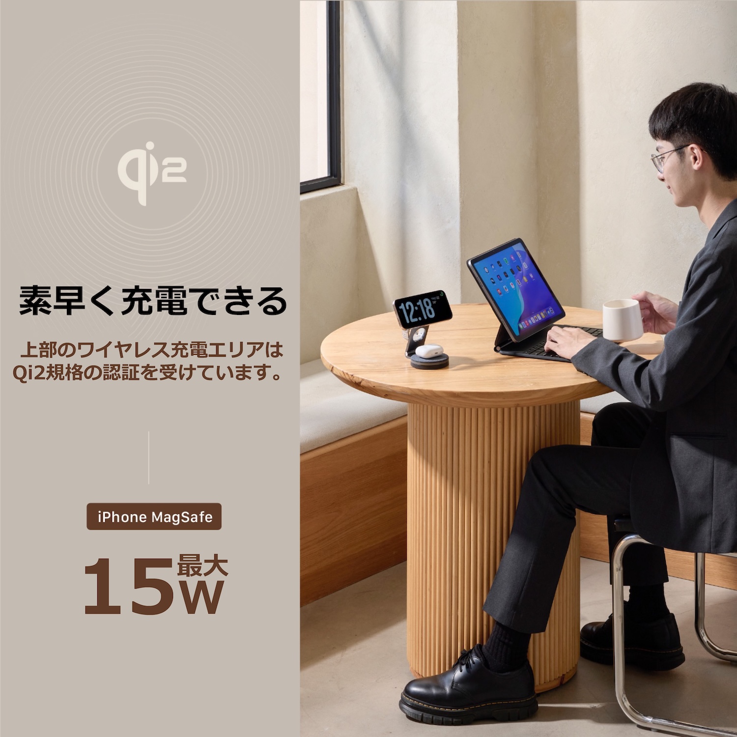 iPhone、Apple Watch、AirPodsなど3台の機器を同時に充電できるQi2対応の急速充電スタンドです。