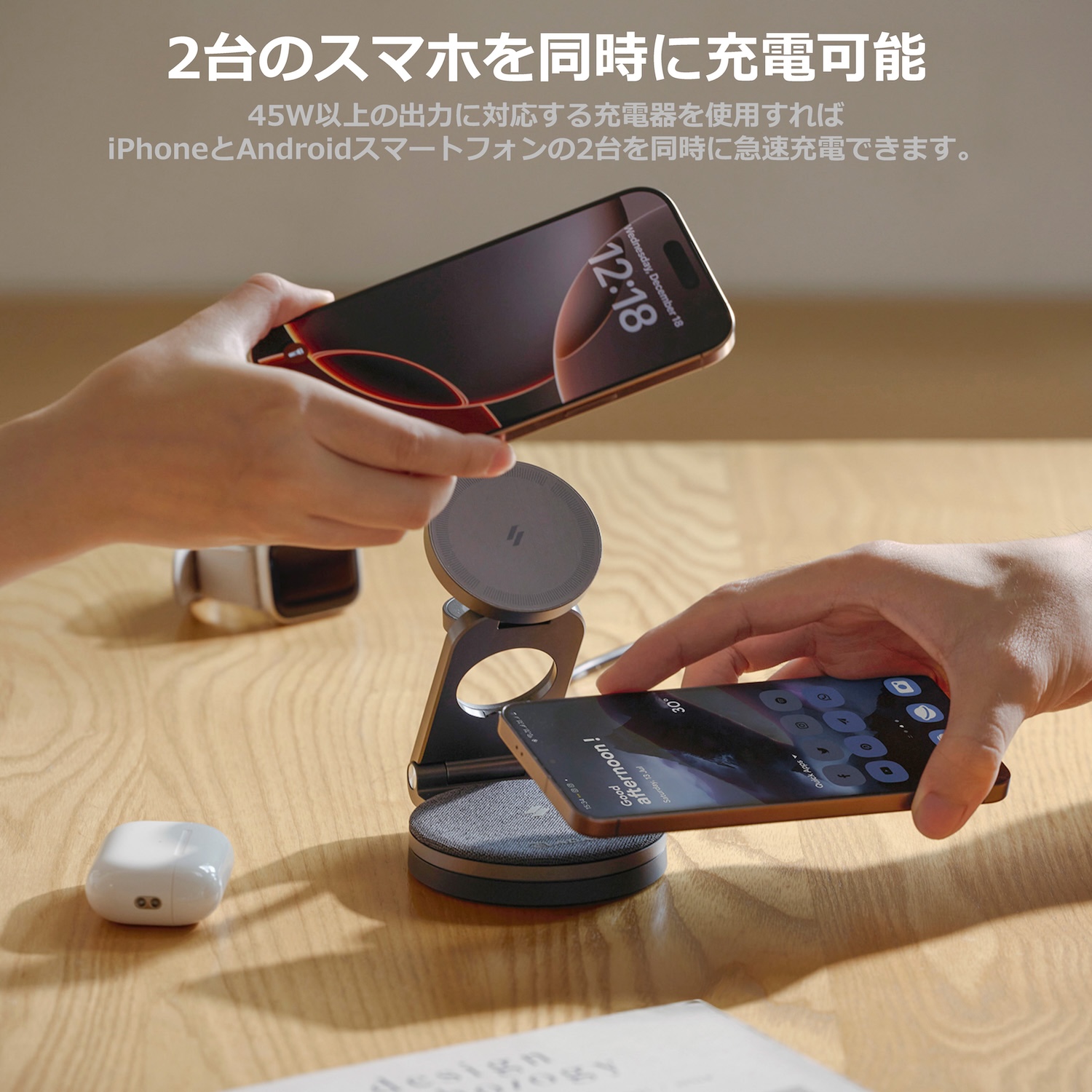 45W以上の出力に対応する充電器を利用する事で、2台のスマートフォンを同時に充電できます。