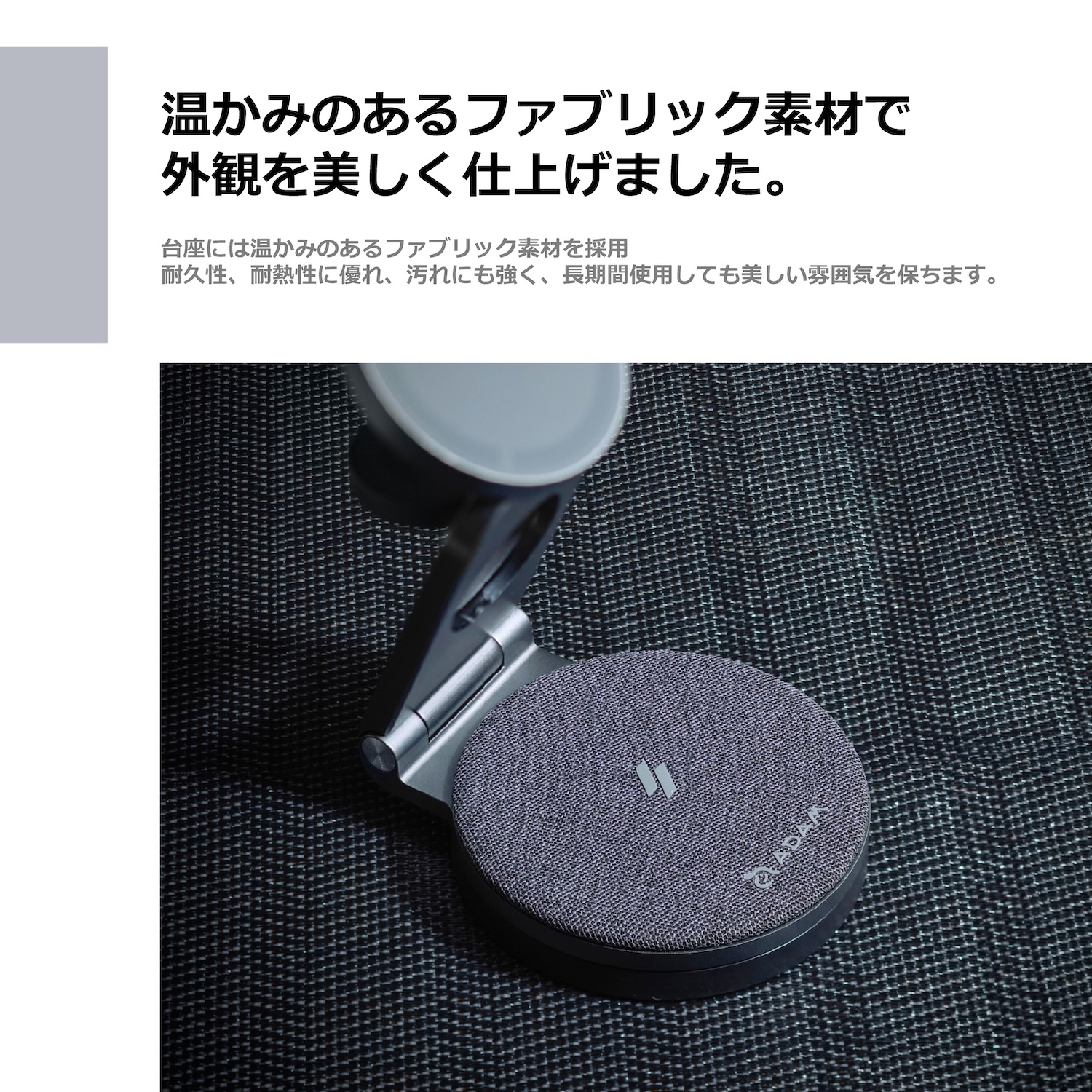 台座部分は温かみのあるファブリック素材なので耐久性を備え、汚れにも強く長期間利用いただけます。