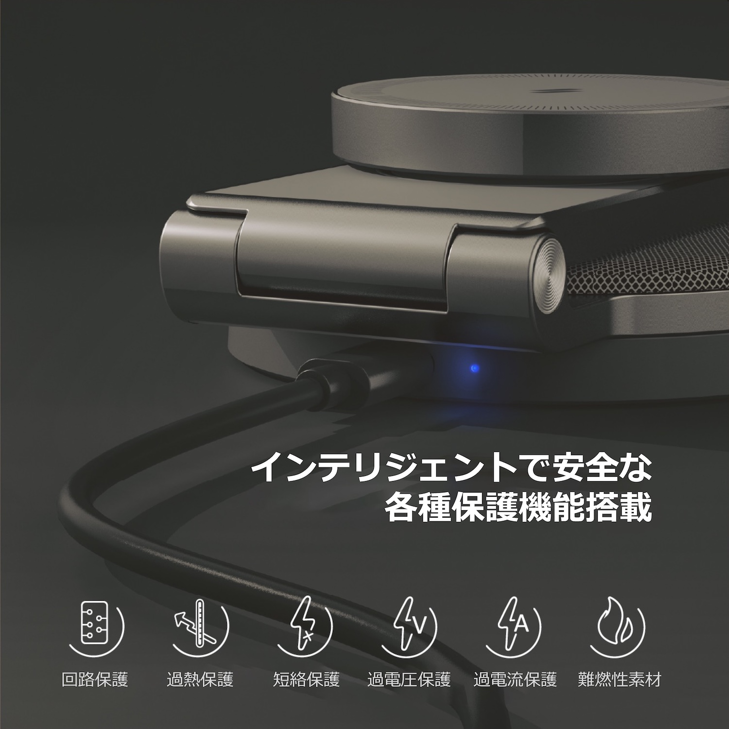 回路保護、過熱保護、短絡保護、過電圧保護、過電流保護などの保護機能を搭載し、材質には難燃性素材を採用しています。