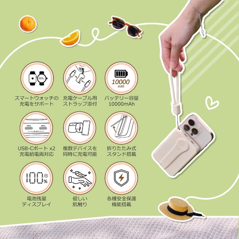 最大20Wの出力に対応する2つのUSB-Cポートを搭載する大容量10000mAhのモバイルバッテリーです。