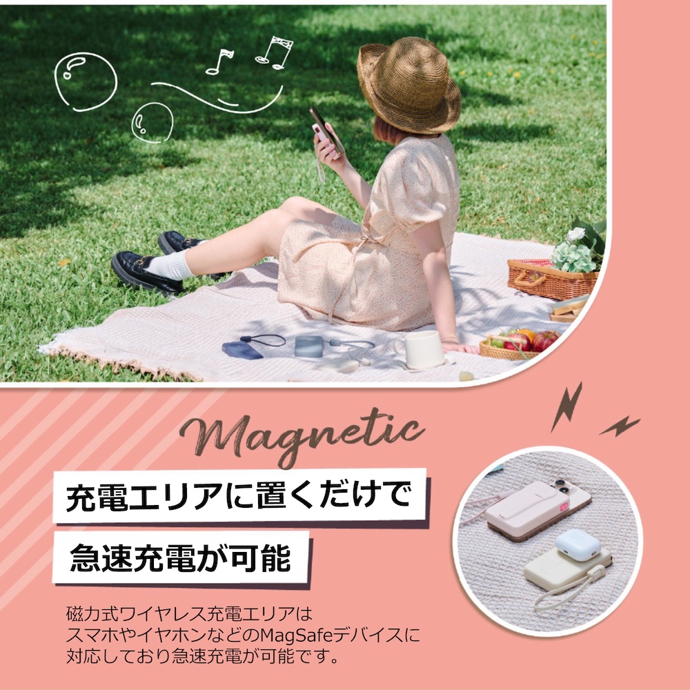 ワイヤレス充電エリアはMagSafeデバイスに対応しており、置くだけでスマホやイヤホンの急速充電が可能です。