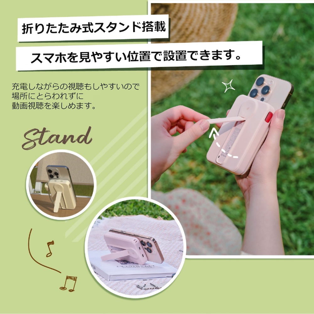 スマホを見やすい角度に調整できるスタンドを搭載しているので充電しなら手ぶらで動画視聴が楽しめます。