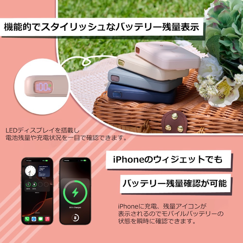 機能的でスタイリッシュな電池残量表示ディスプレイ搭載に加え、iPhoneのウィジェットに対応しており、瞬時に電池残量や充電状況を確認できます。