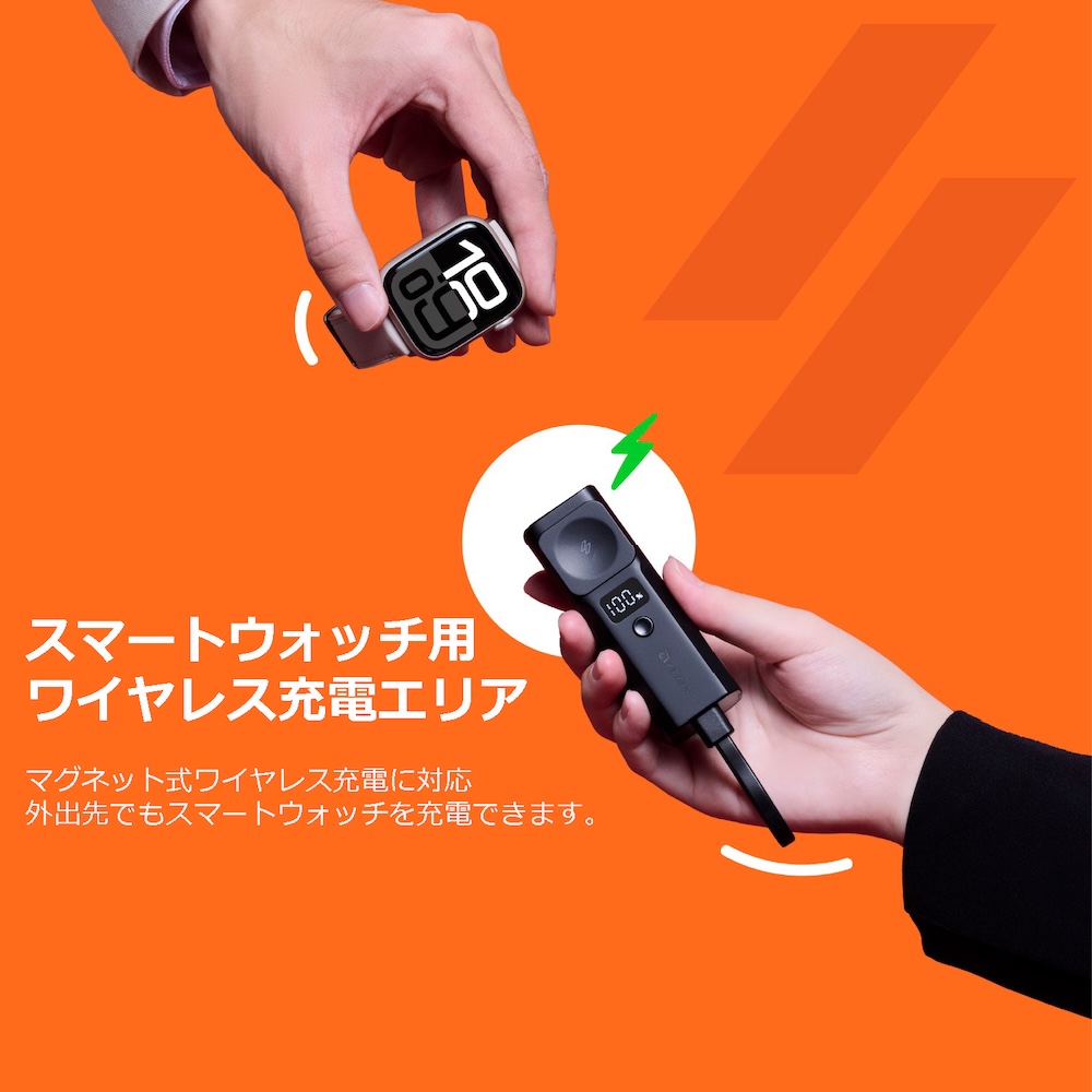 Apple WatchおよびSamsung Galaxy Watchに対応するワイヤレス充電機能も備えており出張時や旅行時に最適なアイテムです。