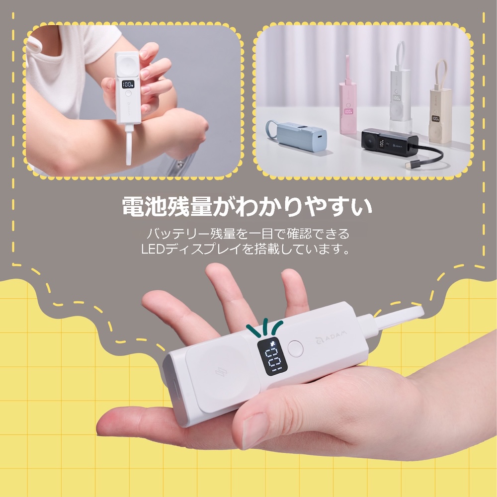 電池残量を表示するLEDディスプレイを搭載しており、電池残量や充電状況などを簡単に確認できます。