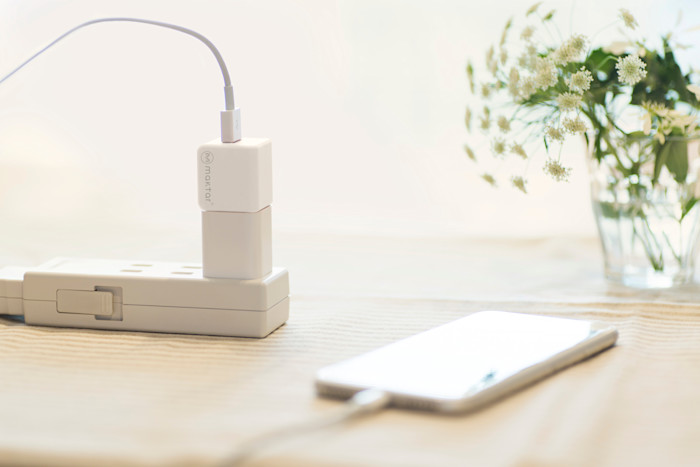 - Qubiiをお手持ちのUSB電源アダプタと充電ケーブルの間に挟むようにつなぐ